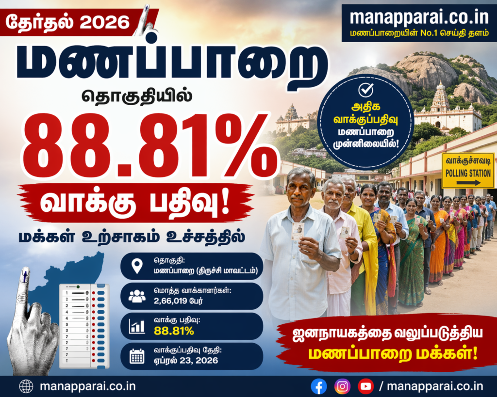 இந்த முறை மணப்பாறையில் பதிவு செய்யப்பட்ட 88.81% வாக்கு பதிவு, மக்களின் ஜனநாயக விழிப்புணர்வை தெளிவாக காட்டுகிறது.